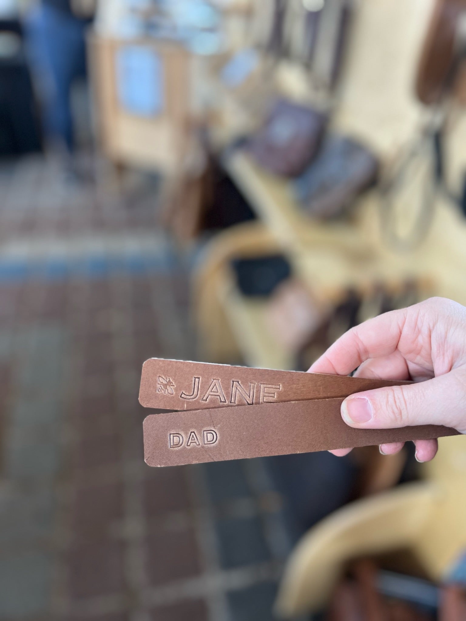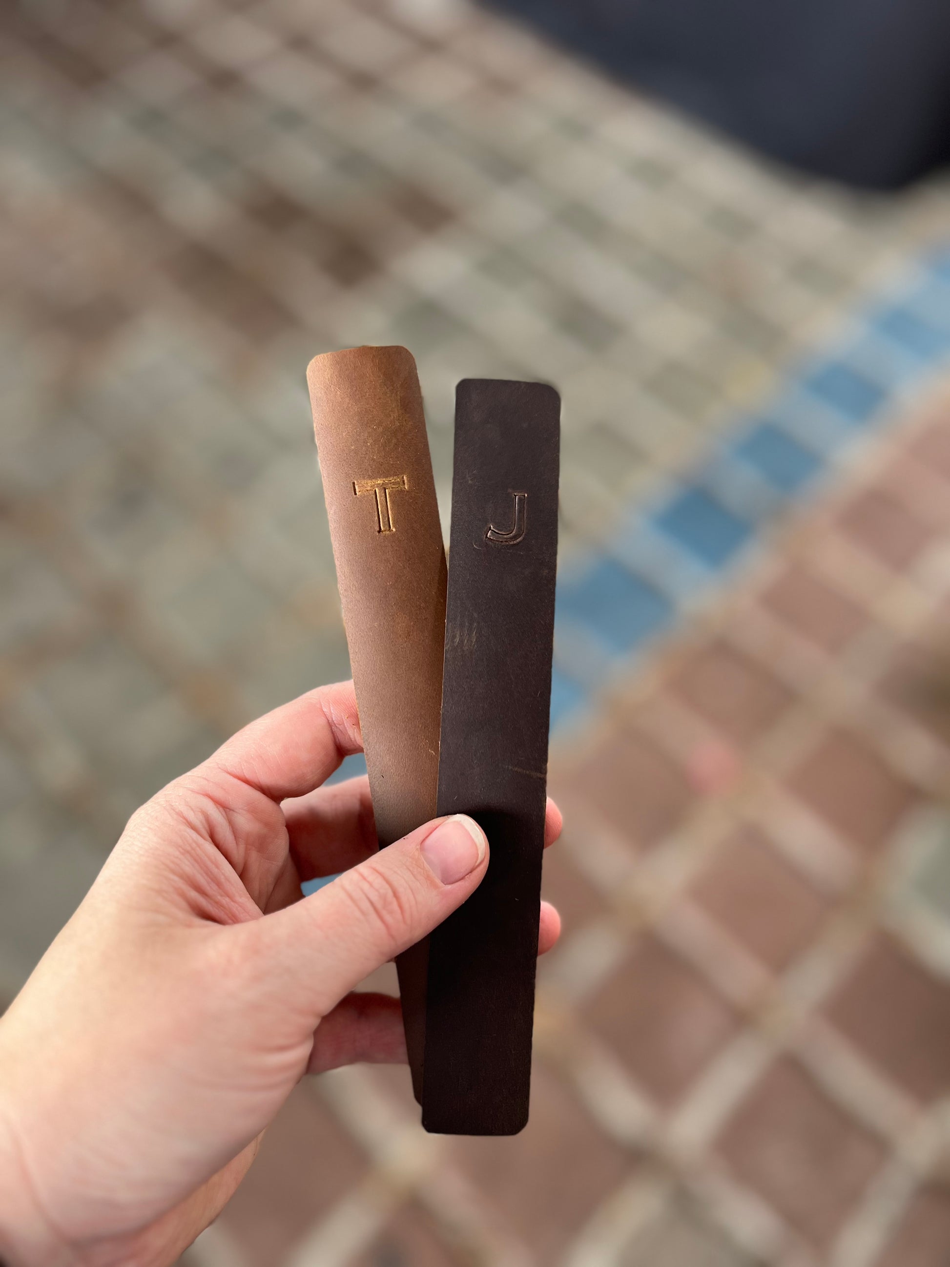 As a part of The Leather Bar, you can add a hand-stamped letter, monogram, name, or symbol. Some ideas include names/initials/monograms, dates, or even a bumble bee.