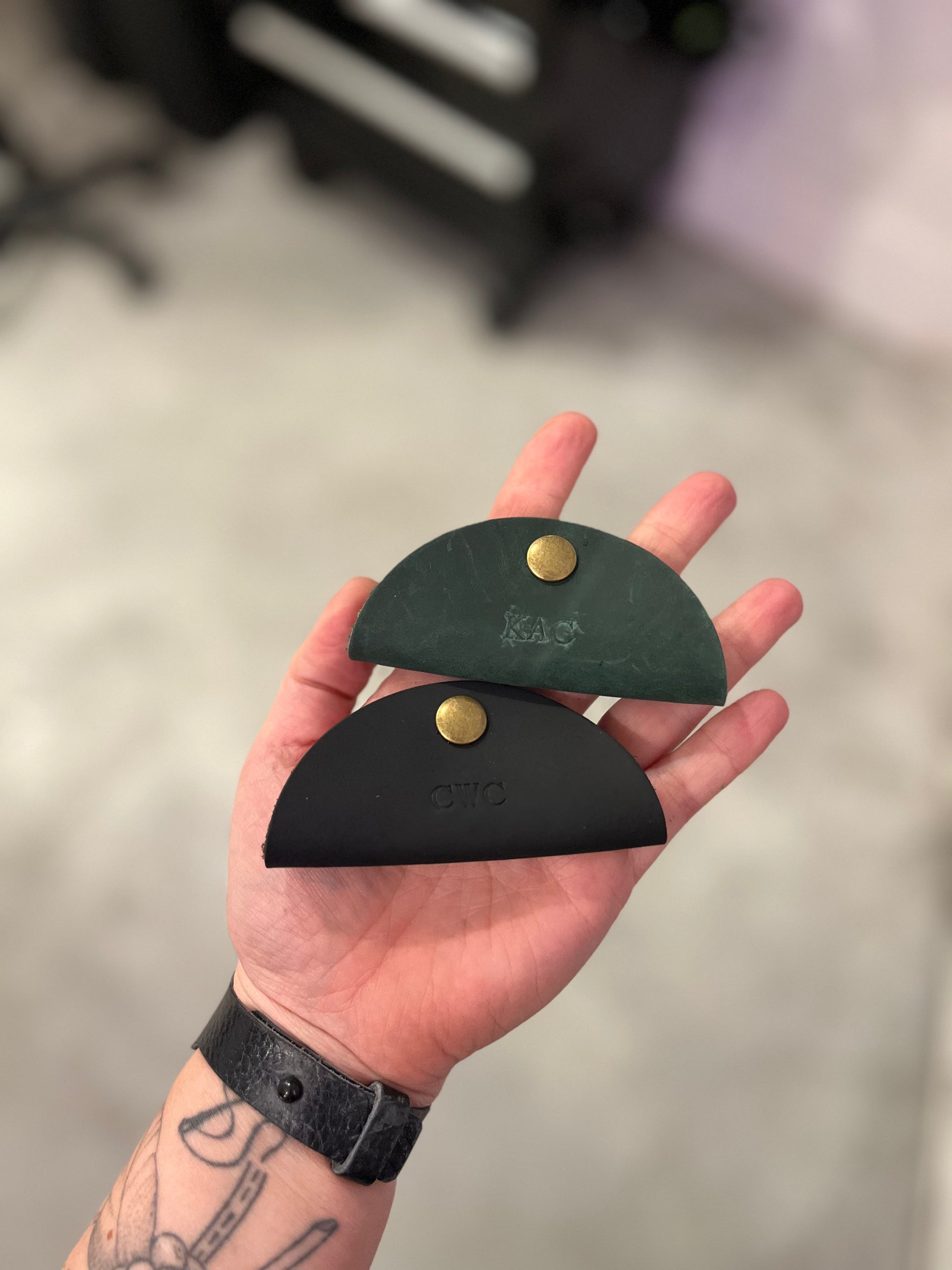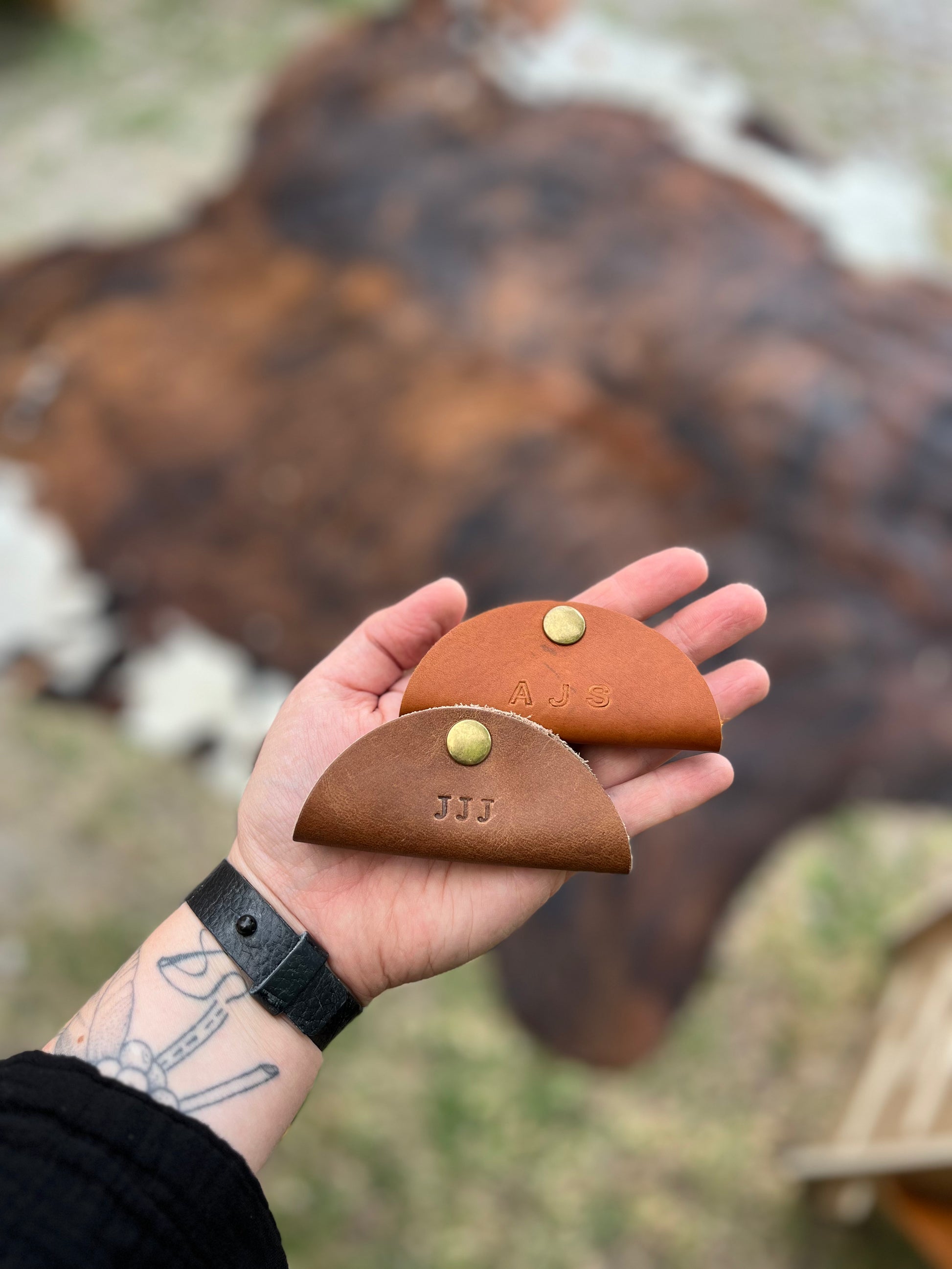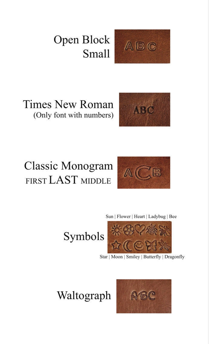 As a part of The Leather Bar, you can add a hand-stamped letter, monogram, name, or symbol. Some ideas include names/initials/monograms, dates, or even a bumble bee. When selecting Classic Monogram, initials should be typed as FIRST LAST MIDDLE and in all caps, for example, ACB.