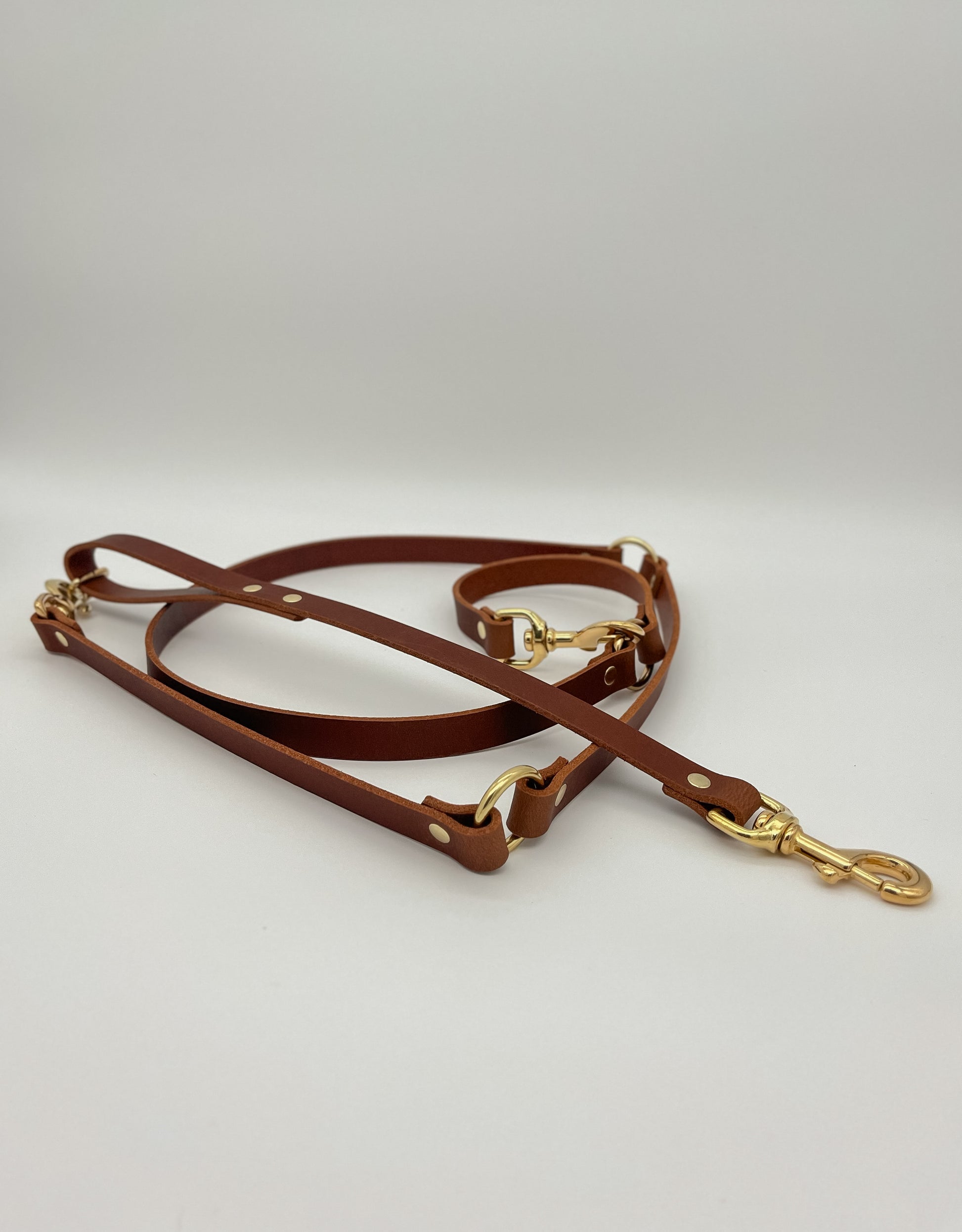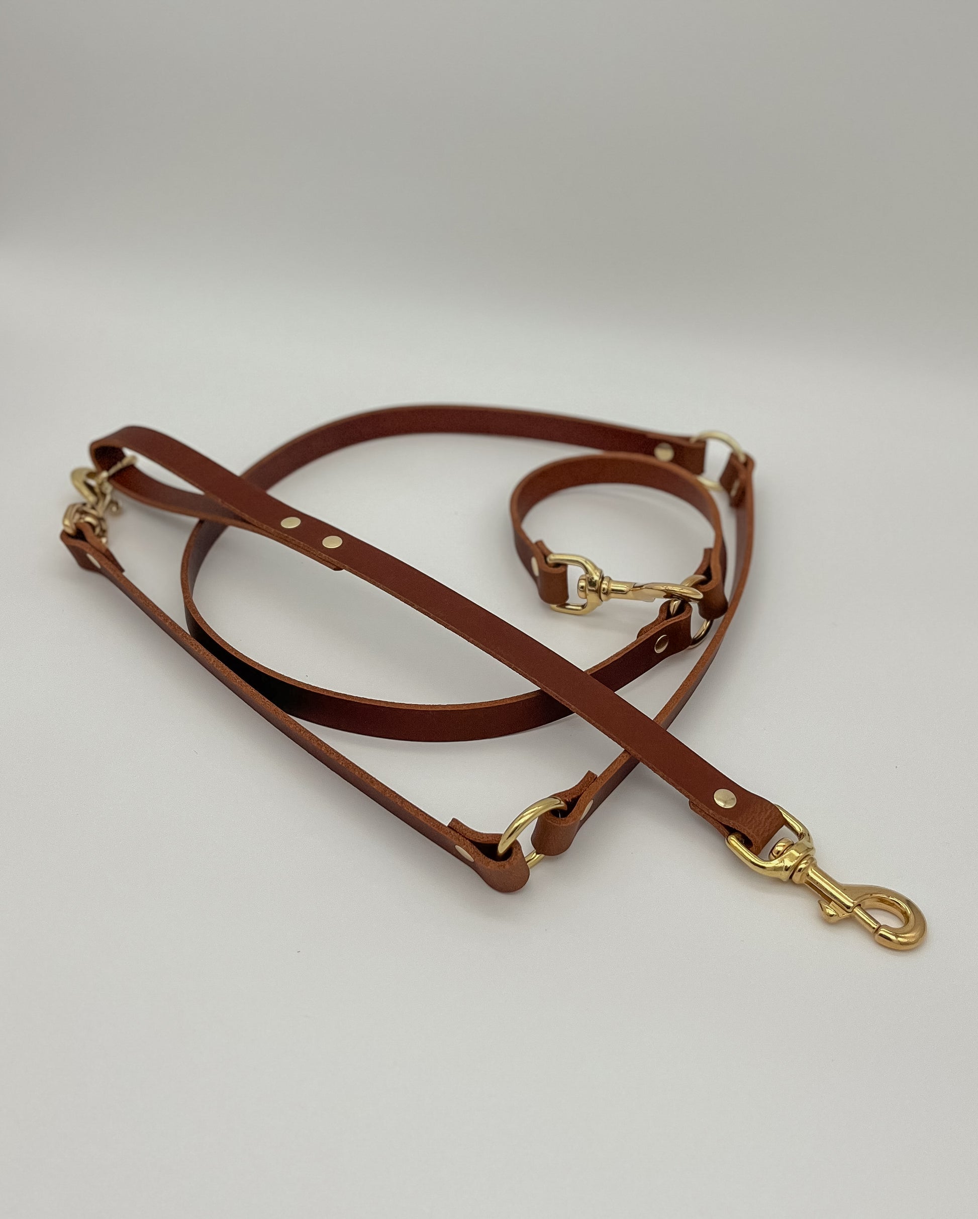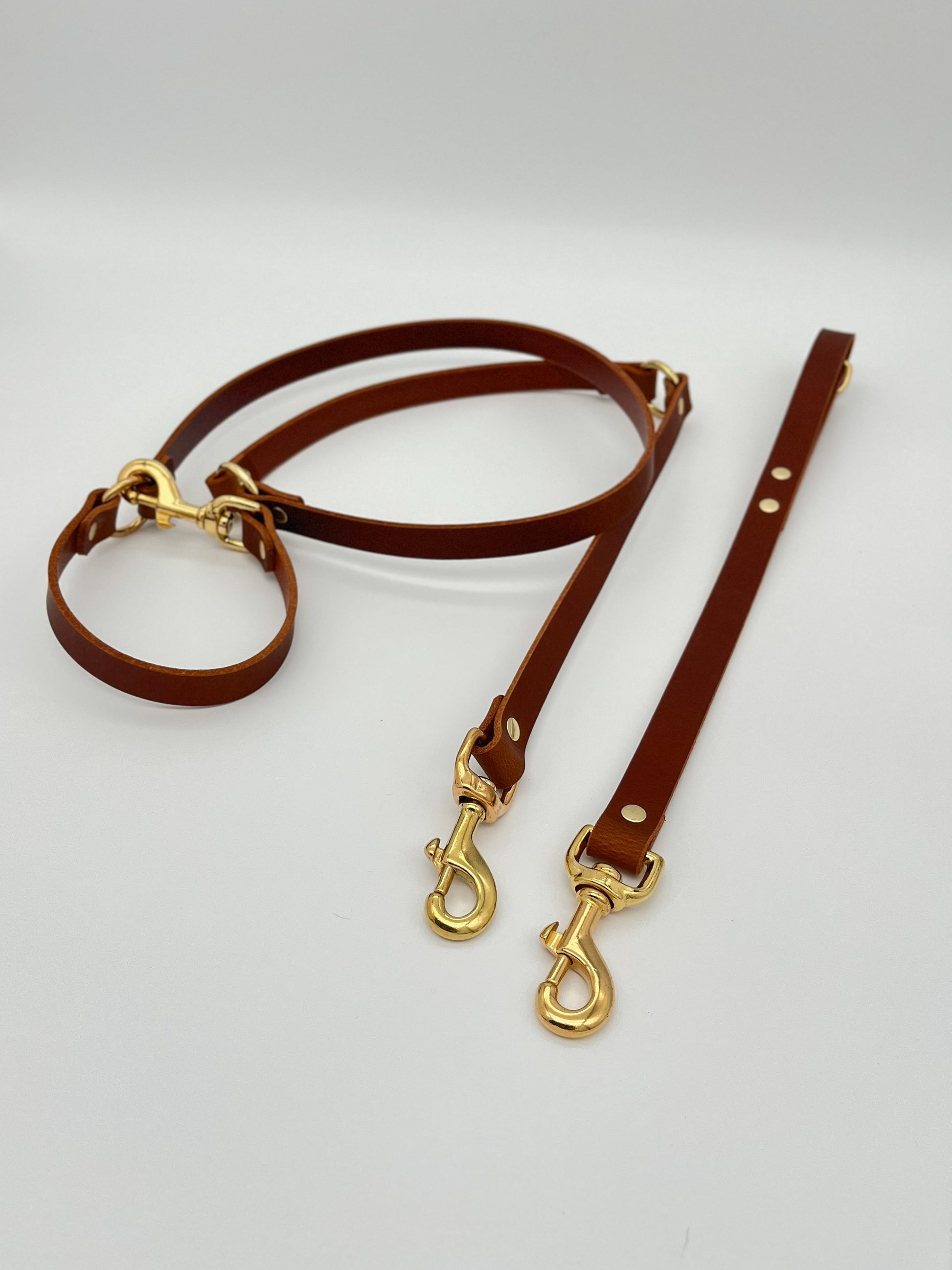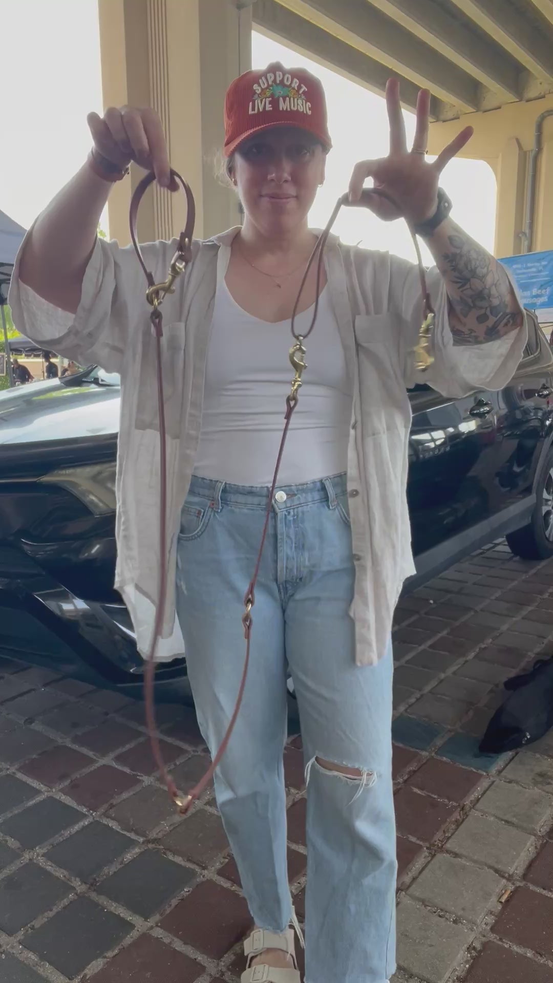 This leash system, which pairs beautifully with our dog collar, is packed with features. While you can use it as a traditional leash with the detachable short lead, you can also convert it into a hands-free leash with a crossbody or belted assembly.