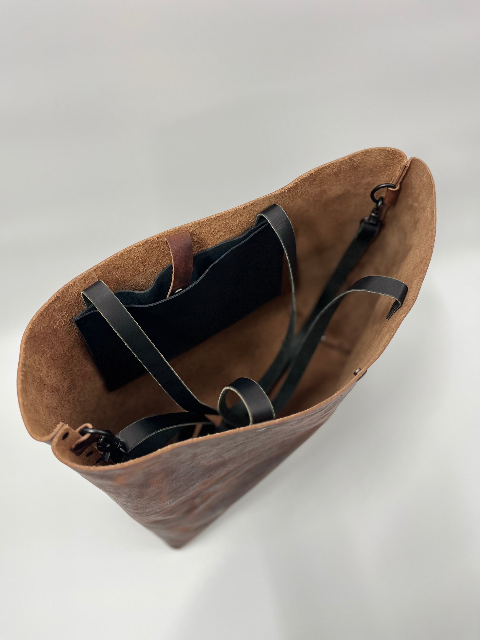 • Includes adjustable Bridle Leather Crossbody strap and inner pocket (shoulder handles drop inside when using long strap)