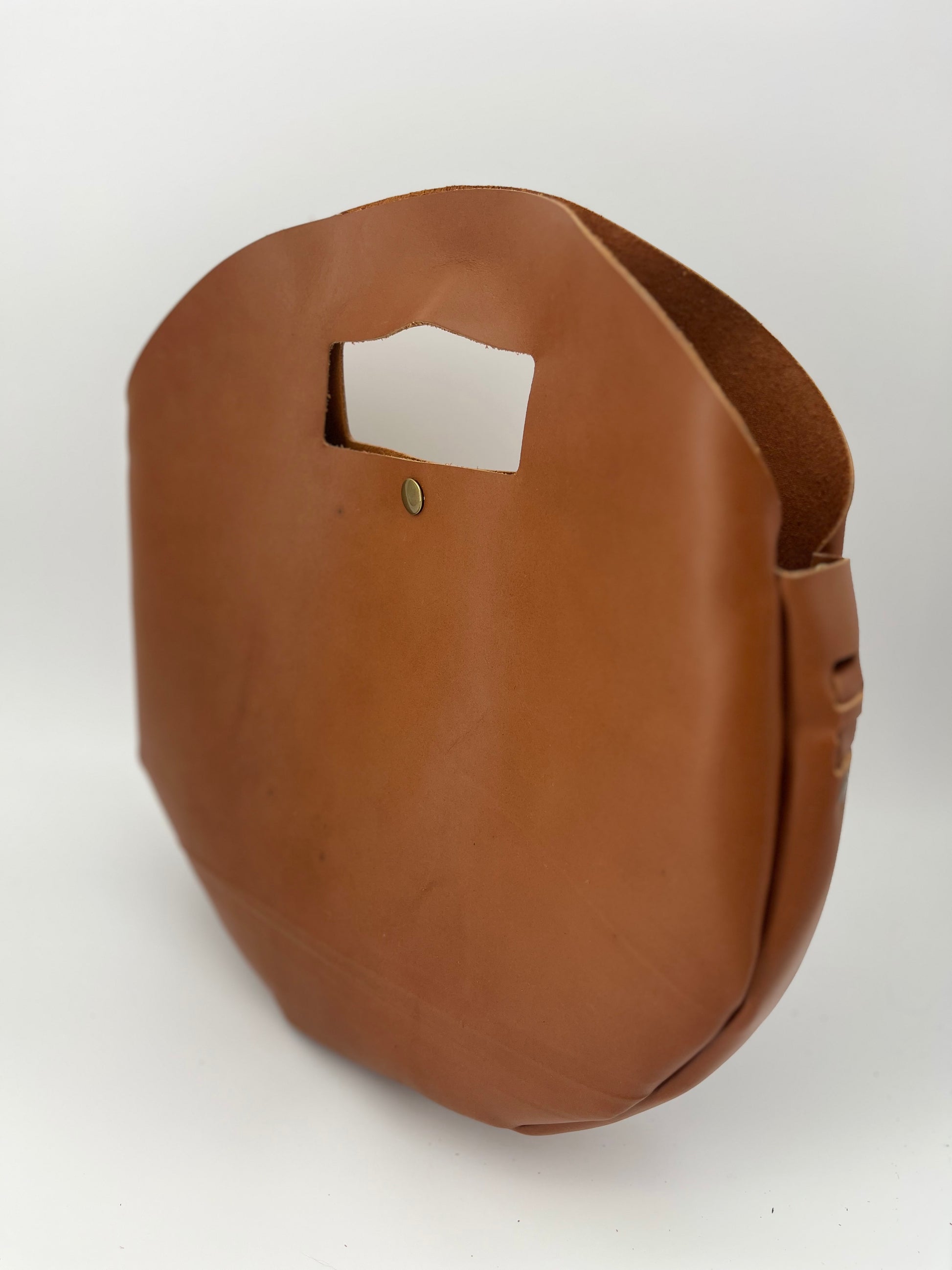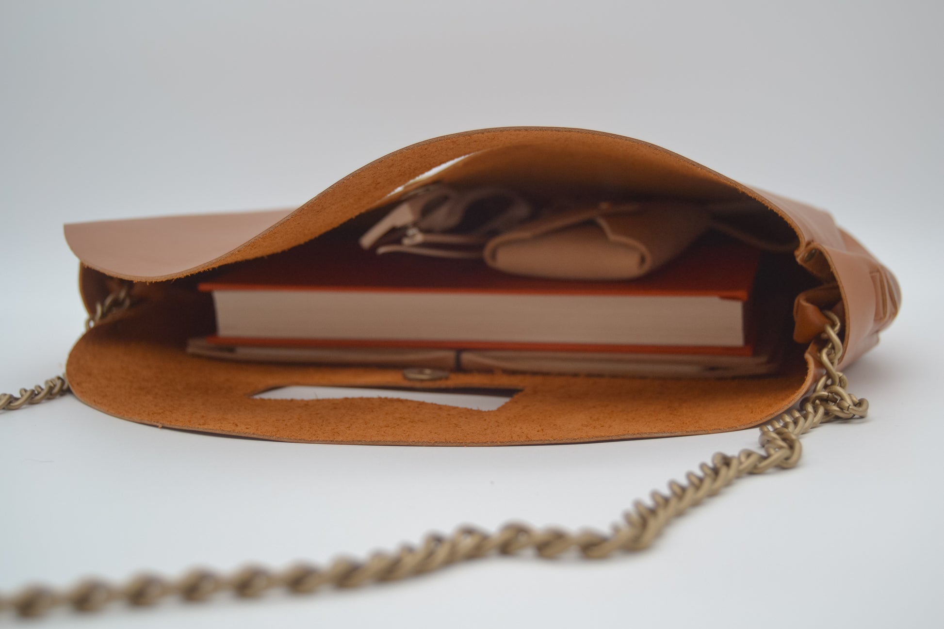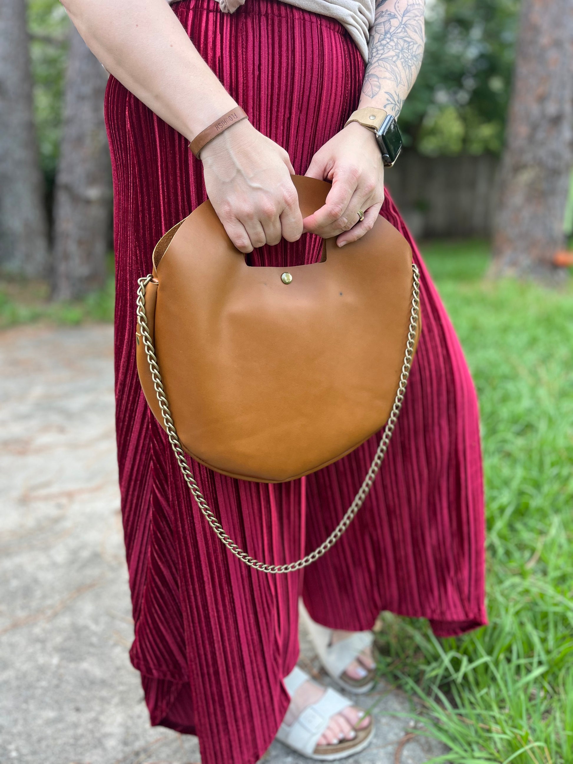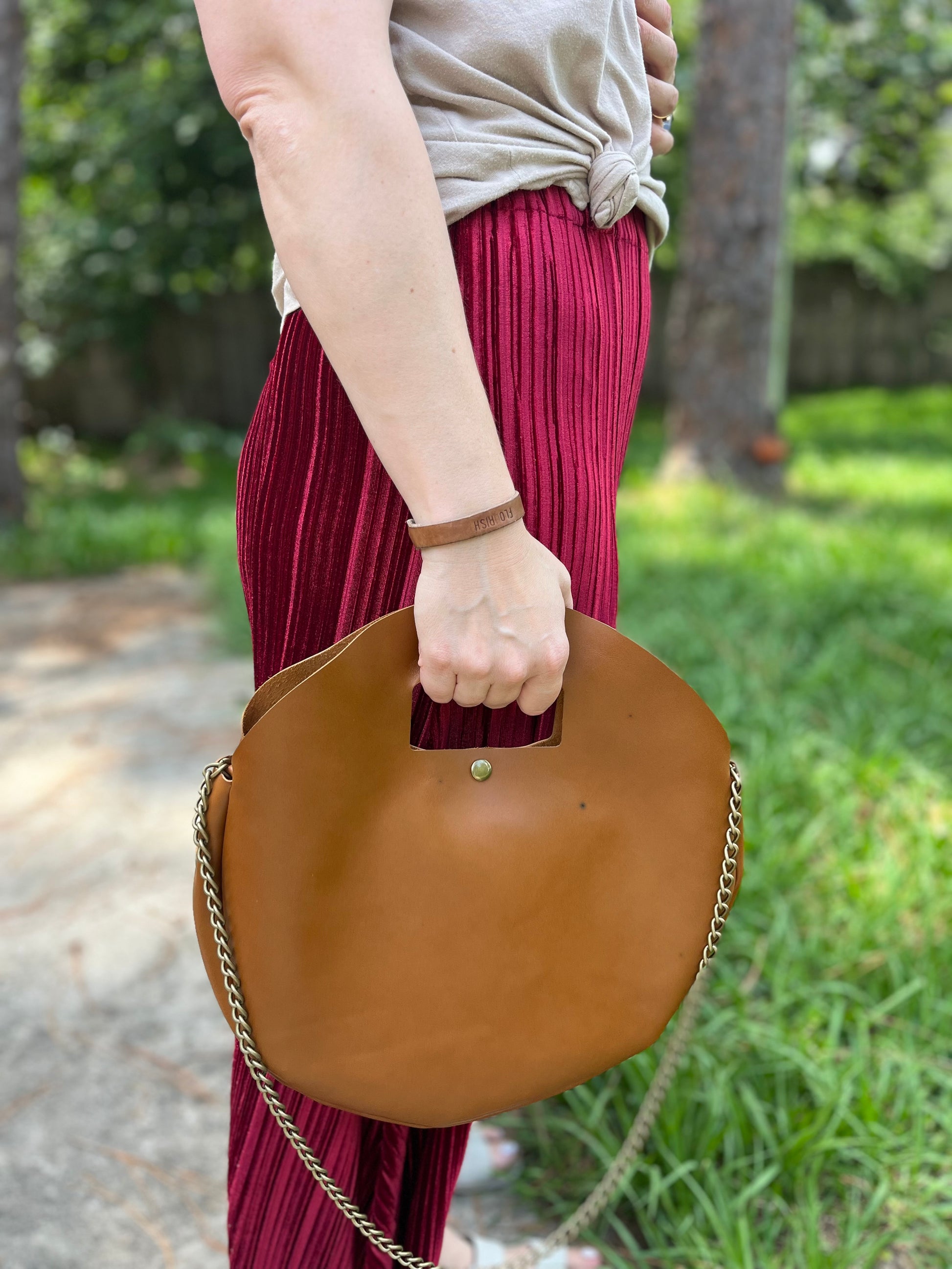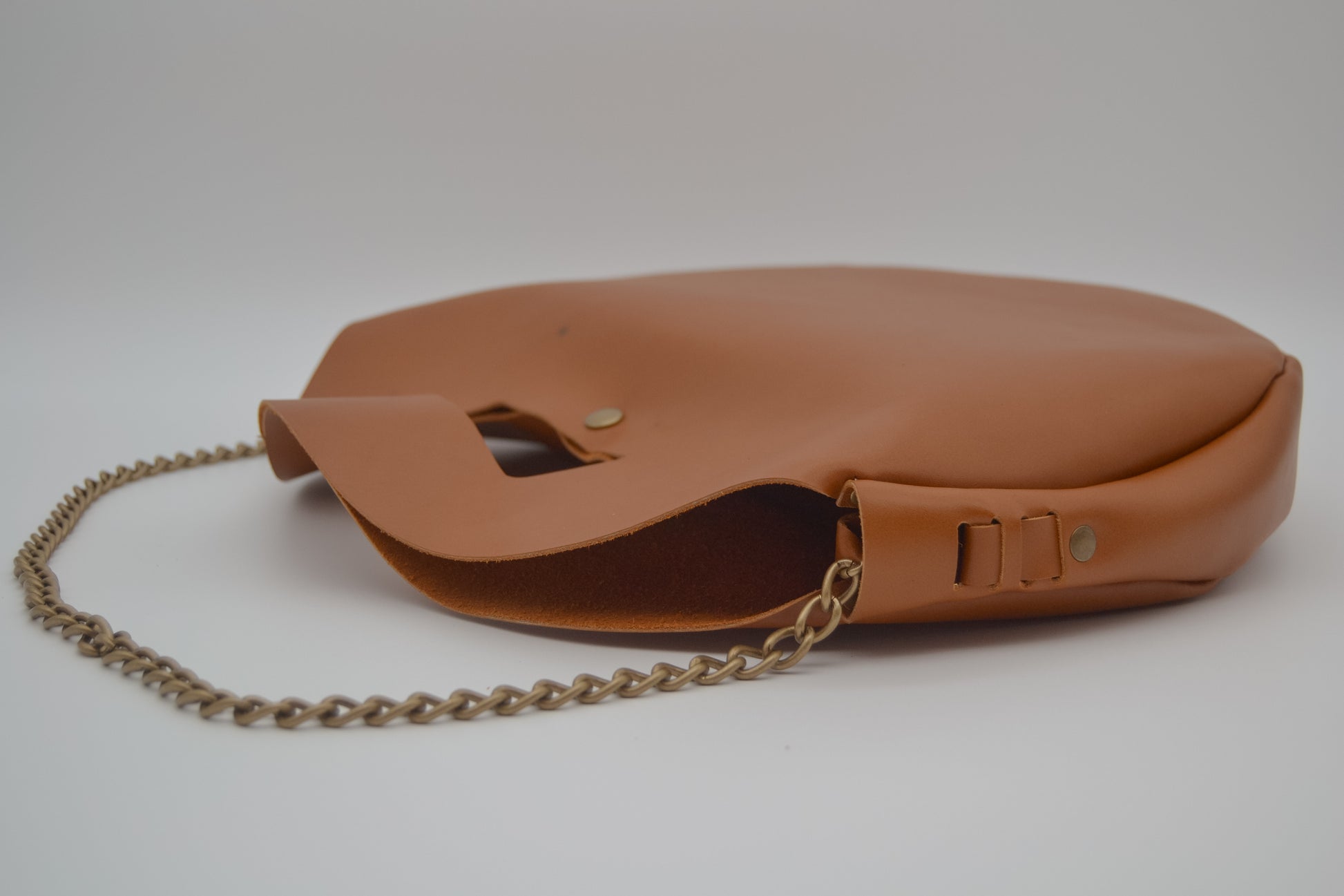 This spacious, full grain leather bag is crafted to carry everything you need without sacrificing style. The roomy interior fits your daily essentials and then some—think wallet, water bottle, a small notebook or tablet, and more—while the cut-out handle and chain add both function and flair.