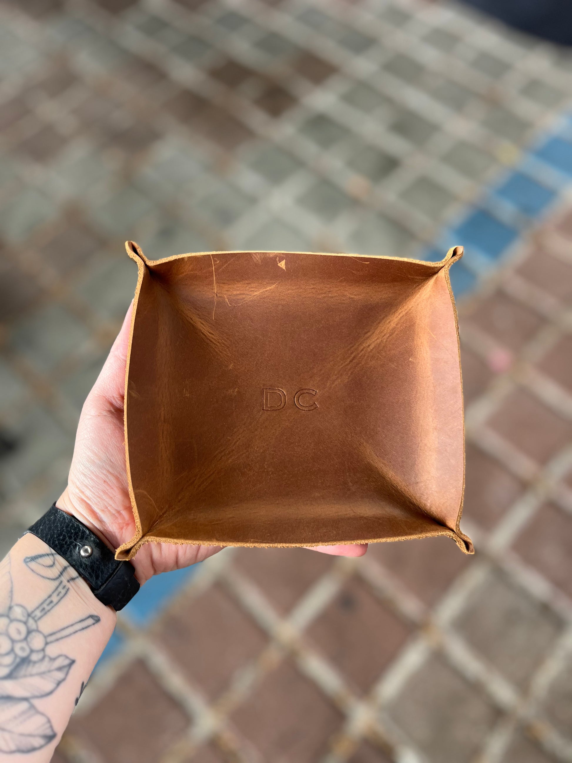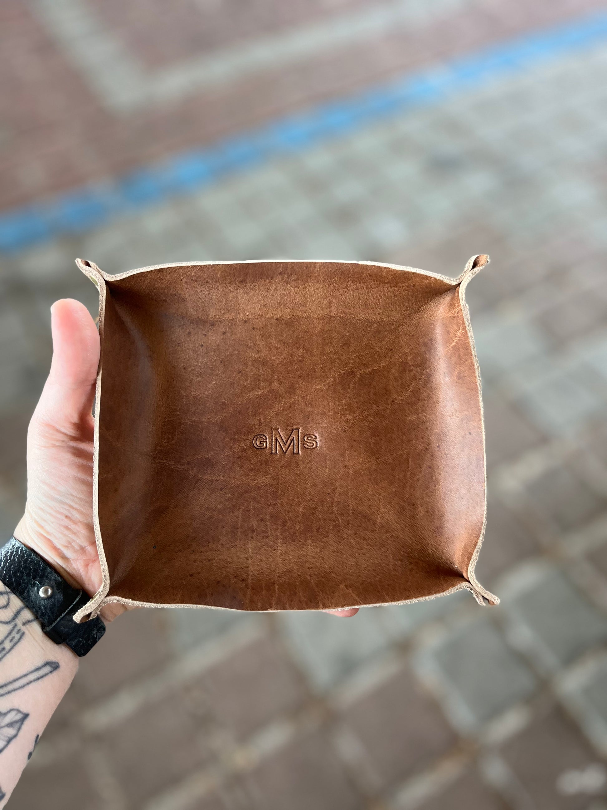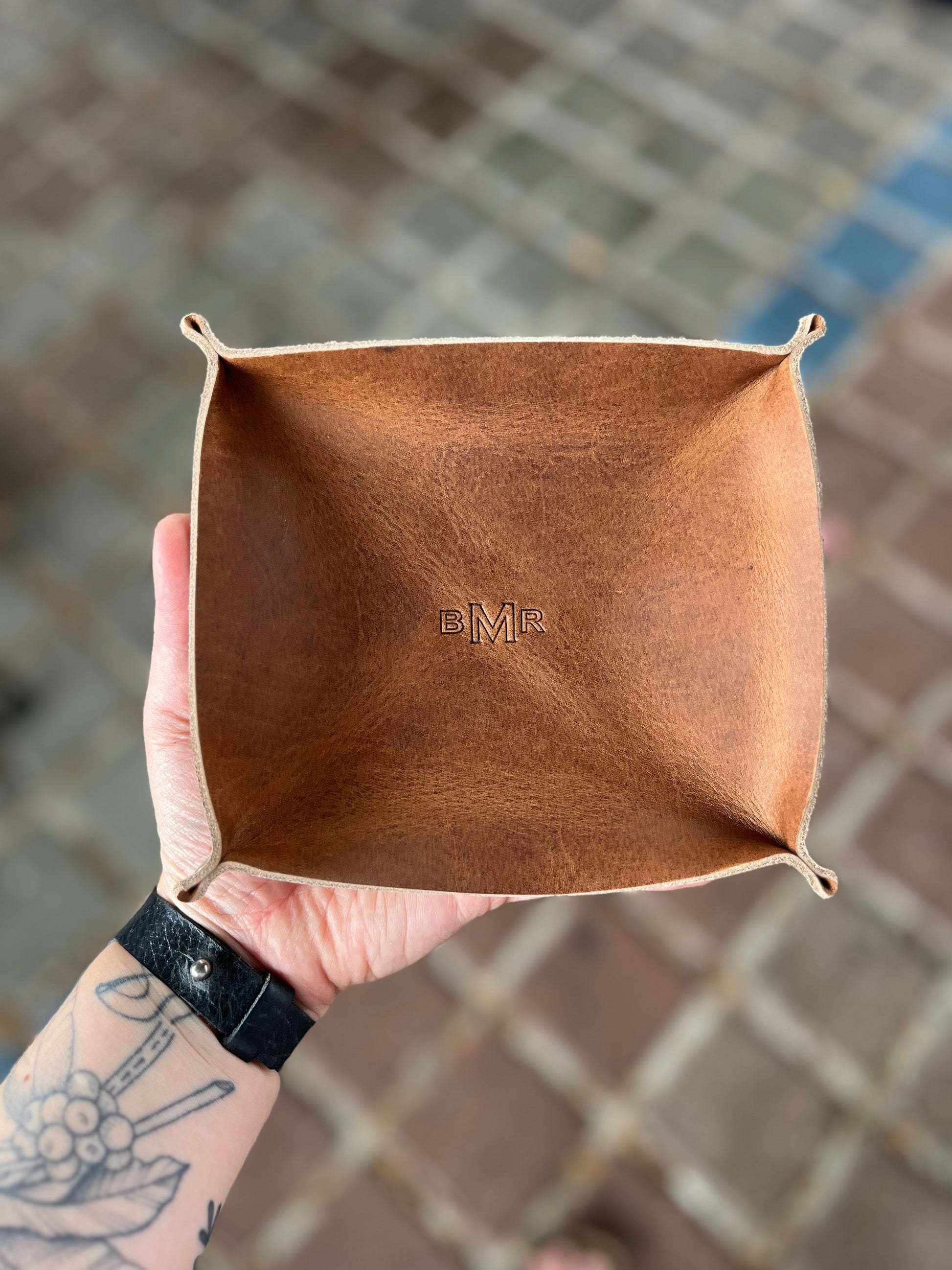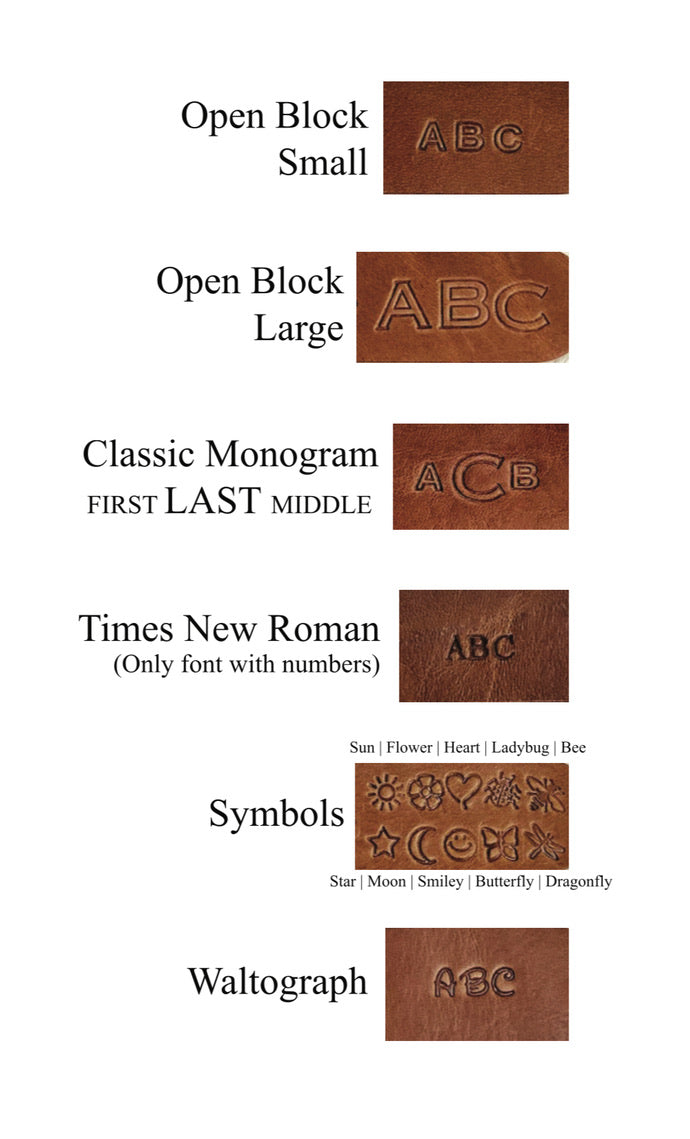 As a part of The Leather Bar, you can add a hand-stamped letter, monogram, name, or symbol. Some ideas include names/initials/monograms, dates, or even a bumble bee. When selecting Classic Monogram, initials should be typed as FIRST LAST MIDDLE and in all caps, for example, ACB.